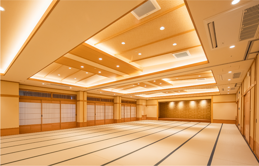 館内で最も大きな宴会場は、最大でお膳形式220名様、イス・テーブル形式120名様まで収容可能。会場は三分割にできるため、大規模なご宴会から小規模のお集まりまで、幅広く対応いたします。