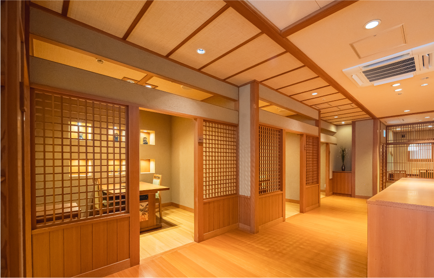 館内の料亭は、1席ごとに仕切られたプライベートな空間でお料理をご提供。イステーブル席と堀ごたつ席があり、ゆったりとお食事をお楽しみいただけます。
