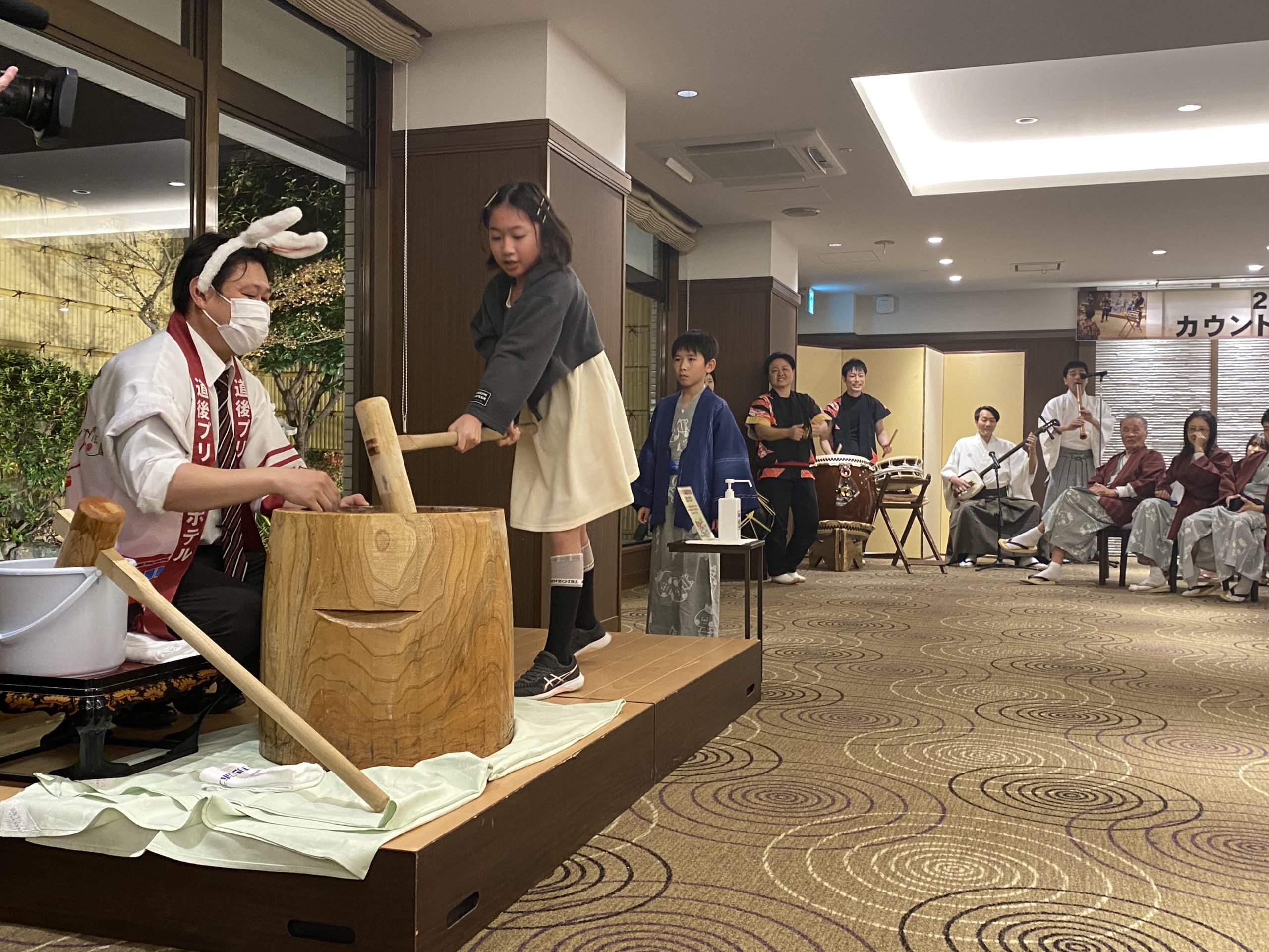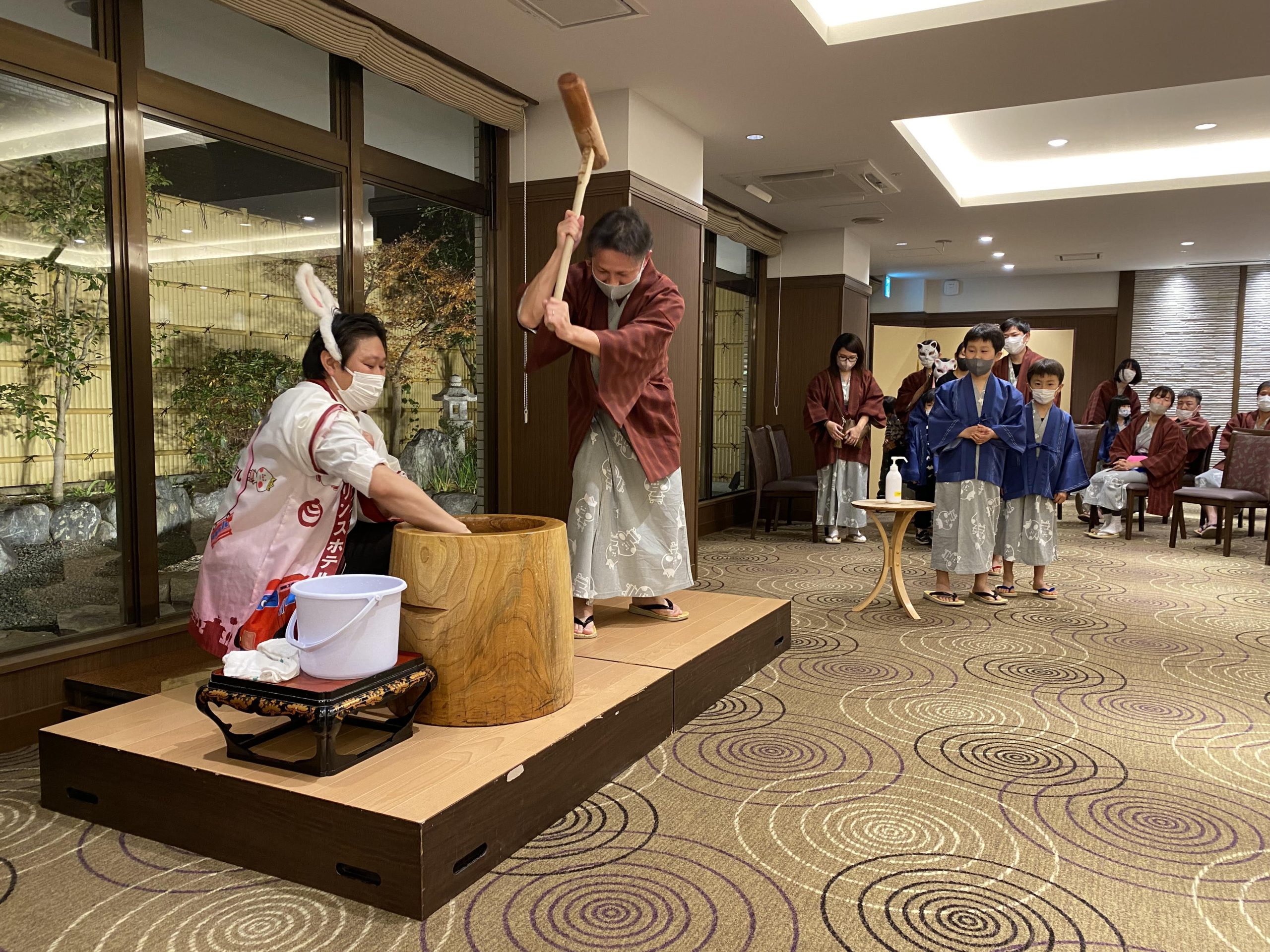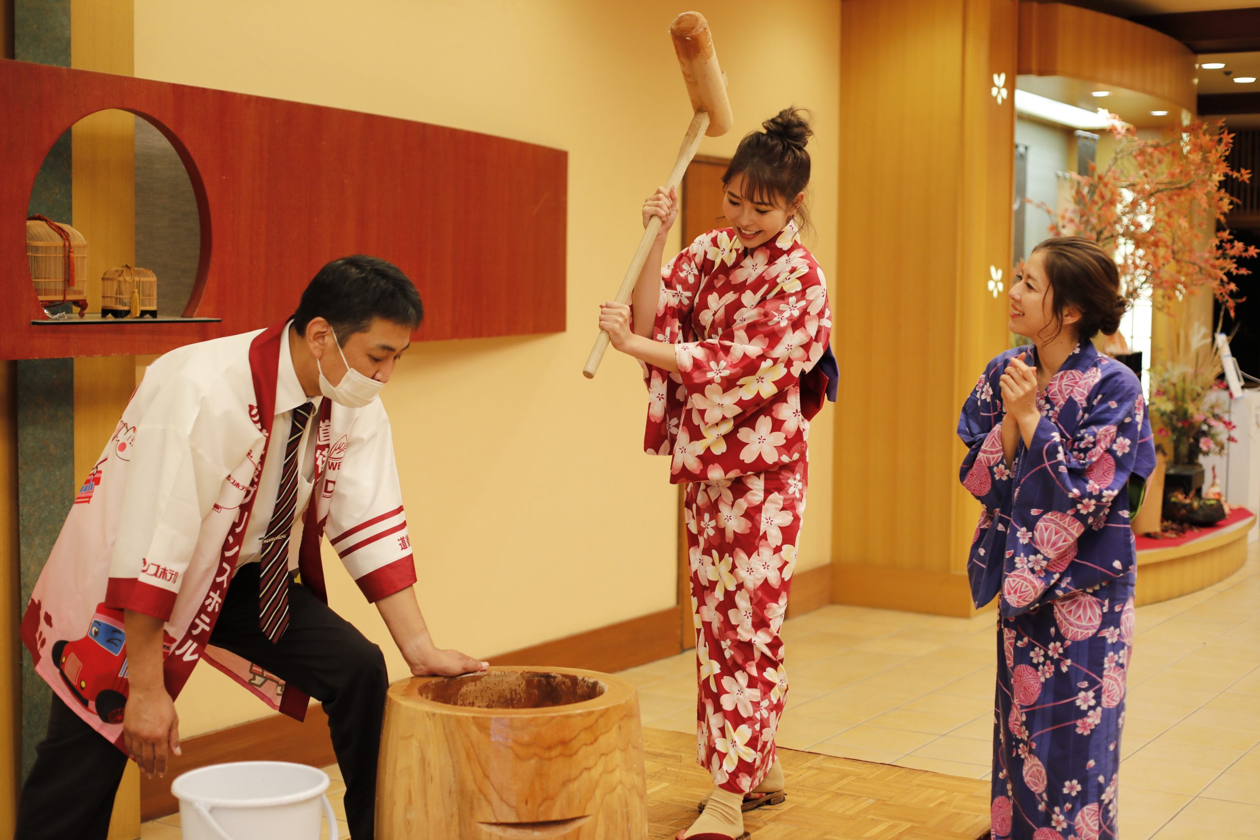 臼と杵を使って、自分の手でおもちをつく体験ができる「温泉もちつき大会」。